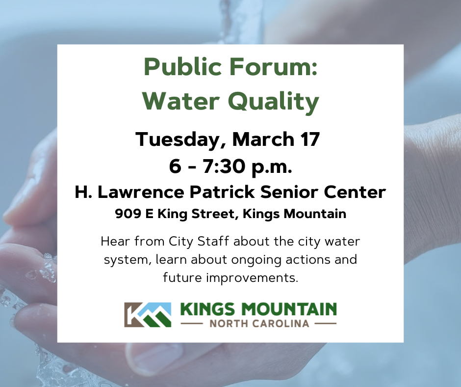 The City of Kings Mountain invites you to attend a Public Forum on Tuesday, March 17, 2026, from 6 p.m. to 7:30 p.m., to discuss important updates regarding our community’s water quality.